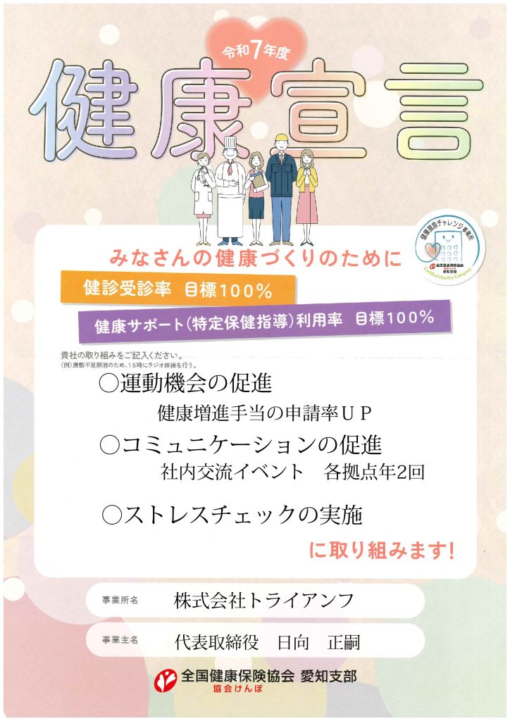 この度、株式会社トライアンフは、全国健康保険協会(協会けんぽ)愛知支部が推進する「健康宣言チャレンジ事業所」として、「令和7年度 健康宣言」を策定し、本年度も引き続き全社を挙げて健康経営を推進していくことを宣言します。